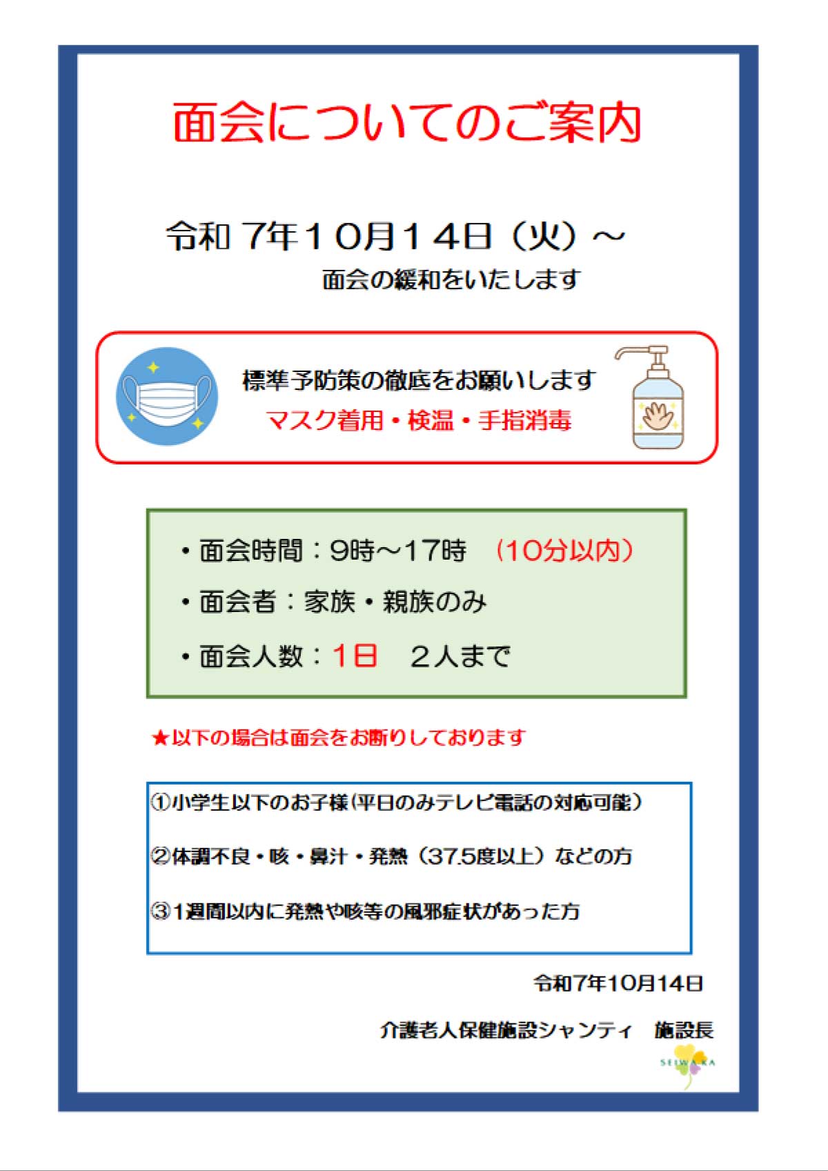 介護老人保健施設シャンティの面会についてのお知らせです。