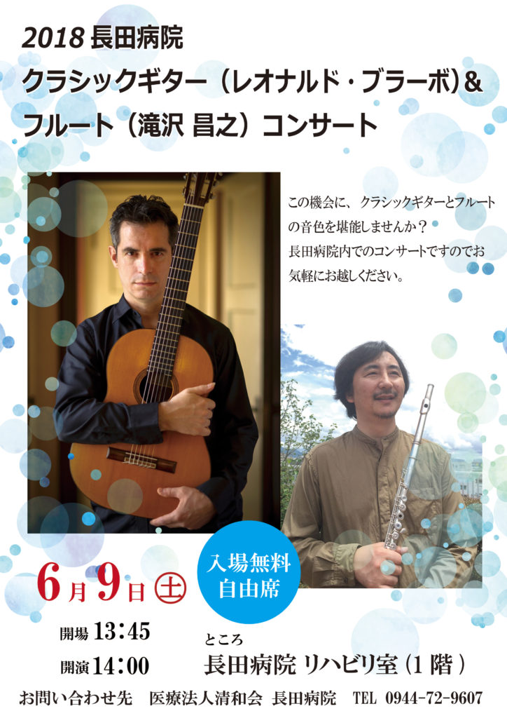 6月9日(土)、クラシックギター(レオナルド・ブラーボ)&フルート(滝沢 昌之)コンサートを開催します。