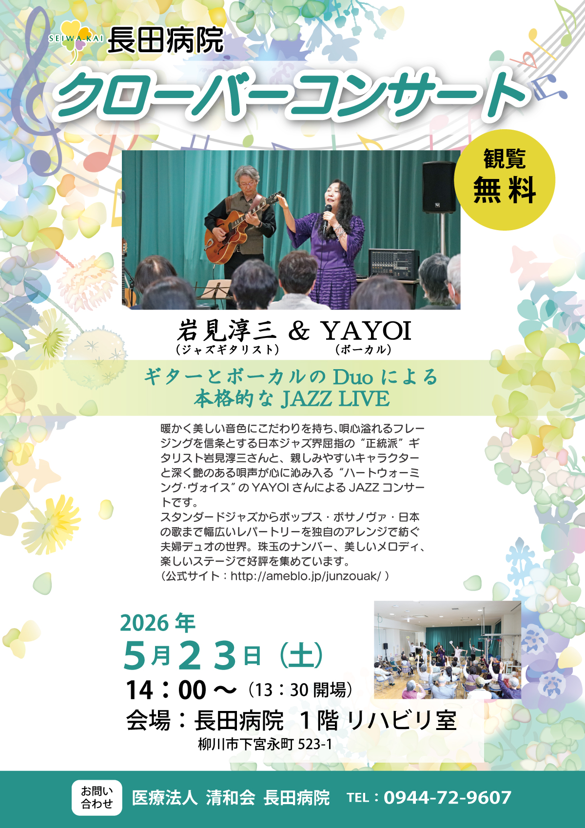 長田病院1階リハビリ室にて、ジャズコンサートを今年も開催します。