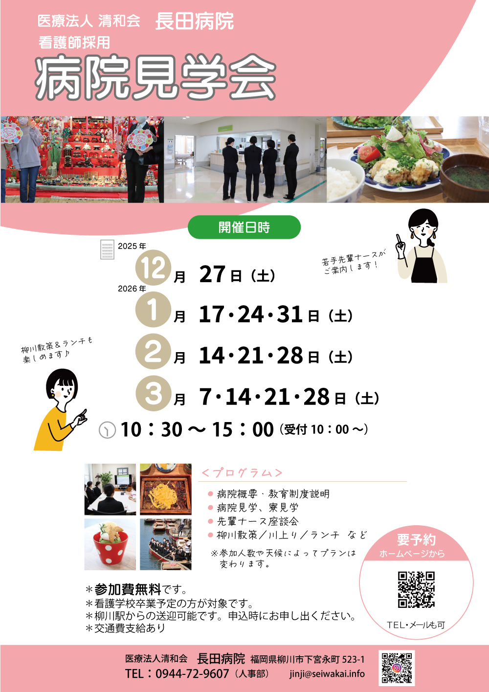 長田病院看護師採用 病院見学会を行います。 病院見学や先輩との交流だけでなく、柳川観光やランチも楽しめるプログラムとなっております。 この機会にぜひご参加ください。 日程:2025年12月27日(土) 2026年 1月17、23、31日(土) 2月14日、21日、28日(土) 3月7日、14日、21日、28日(土) 時間:10:30~15:00 ※ご希望の日程をお知らせください。 詳細は下記をご確認ください↓(クリックで拡大します)お申込みはこちら(長田病院公式LINEへ)